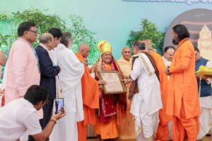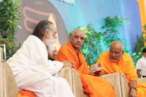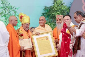 Acharyas also gave a purse of ₹11,00,000/-(Eleven lacs) in appreciation. Param Pujya Sri Swamiji donated this amount to Sadbhavana Vruddhashram, as donation towards one room for poor senior citizens. All Acharyas delivering अनुग्रह भाषणम् lauded the services of Puj Sri Swamiji and profusely praised Param Pujya Sri Swamiji.