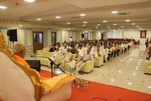 Puj Swamiji was invited by Kuchchh Kadva Patidar Samaj and Kuchchh Kadva Patidar Yuvak Mandal of Kharghar-Navi Mumbai for two functions on 23 June 24 . In morning Puj Swamiji addressed audience of more than 600 people of Patidar Samaj on “ Jivan Jivavani Jadibutti”. Puj Swamiji said “ compare to olden days when female were busy in varieties of domestic chores and male were busy with earning of livelihood. With advent of domestic appliances n automation in day to day life has resulted in saving of time for everyone however reality of life is no one has time. Puj Swamiji stressed on enjoying objects of possession instead shifting focus to pursue other objects that pursuit has no end. “ in afternoon Puj Swamiji conducted interactive session with youth of age 15 to 30. Puj Swamiji asked youth to perform an exercise to bring out strength of relationship among family and how that can be exploited for personal growth on such competitive environment. Here are few photographs of both the sessions.